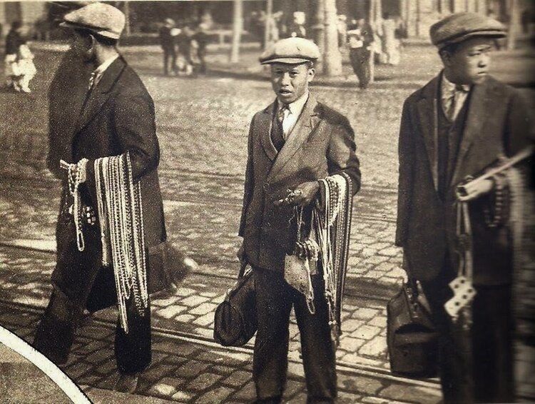 Los chinos iban y venían calle arriba y calle abajo con sus mercancías, que vendían en la acera. Los muchos que llegaron, sobre todo en los años veinte, al Barrio vestían traje y portaban maletines con las baratijas y mercancías como abanicos, pipas, collares y dragones de papel, que ellos mismos confeccionaban.